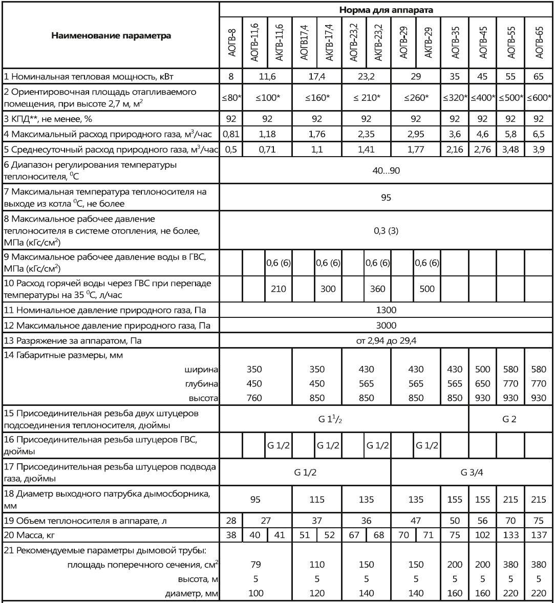 Котел Очаг полностью энергонезависим и работоспособен в отопительных системах с нормальным (рабочим) давлением до 3 атм как закрытого - принудительного типа с насосом, так и открытого типа при естественной циркуляции теплоносителя. Маркировка агрегатов "Очаг" достаточно проста, рядом с аббревиатурой А-К-Г-В (аппарат комбинированный газовый водогрейный) стоит цифра, указывающая на мощность котла в кВт, после которой буква указывает на автоматику котла: